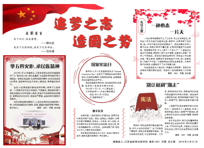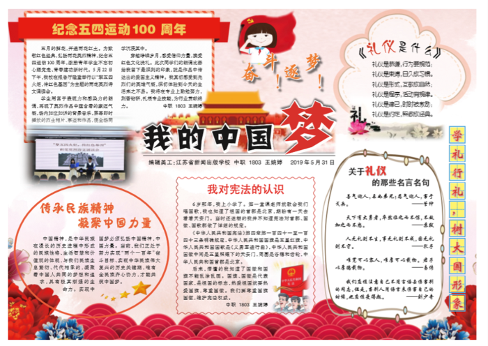 “奋斗新征程,逐梦新时代”。在迎接中华人民共和国成立70周年、纪念五四运动100周年之际,为了响应号召,八名电子小报参赛选手在创作中紧密结合课堂所学德育知识和专业排版知识,以“学礼行礼,树大国形象”,“传承民族精神,凝聚中国力量”和“弘扬宪法精神,传递法治力量”三项内容为落脚点,在傅晓慧、马颖、赵为垚三位老师的指导下夜以继日地进行创作、修改和校对。参赛师生们认真投入的参赛热情,终于换来了可喜的成绩,我校选送的五幅电子小报作品全部获奖。具体获奖名单如下: